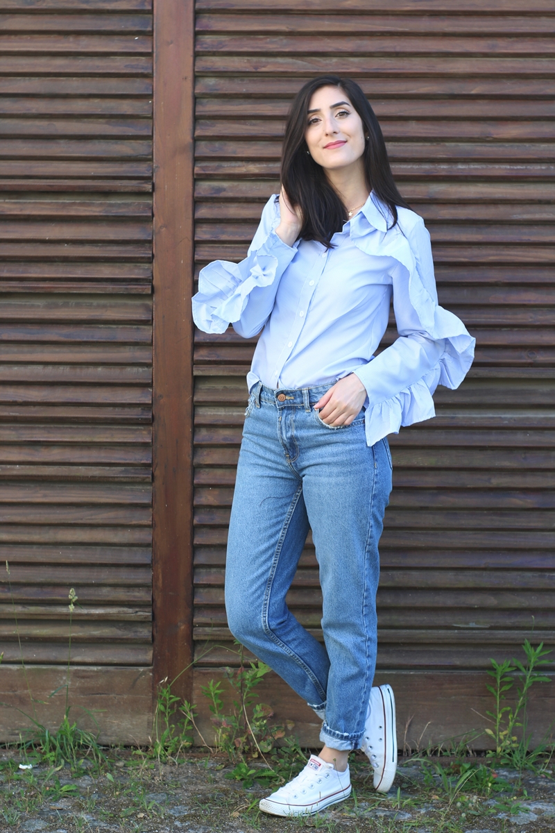 Hoje trago-vos um look com duas peças novas que já se tornaram minhas favoritas. Em primeiro lugar vou falar sobre a camisa, como apaixonada que sou por folhos não podia estar mais satisfeita com ela. É azul às riscas, cheia de folhos nos braços, serve perfeitamente e tem uma excelente qualidade. Recebia juntamente com a blusa que vos mostrei neste look, da loja Yoins. Quantos às calças, já não são novidade por aqui, usei-as neste look e irei usá-las muitas vezes. São super giras e confortáveis e ficam bem com praticamente qualquer coisa. Preparem-se pois irão ver muitos looks com mom jeans por aqui futuramente. Por fim, e para colmatar este look, usei a minhas all star brancas que vocês já sabem, não as tiro dos pés.